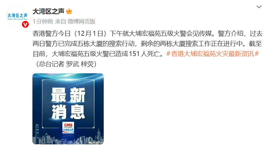 12月1日下午,香港特区政府举行新闻发布会,介绍火灾搜救安置等最新进展。警方表示,大埔宏福苑火灾已造成151人遇难,另有30多人失联。