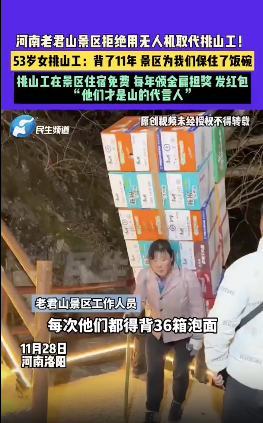 据河南广播电视台民生频道报道,明明无人机搬运更方便、成本低还速度快,河南老君山景区却毅然拒绝,只为保住挑山工们的饭碗。