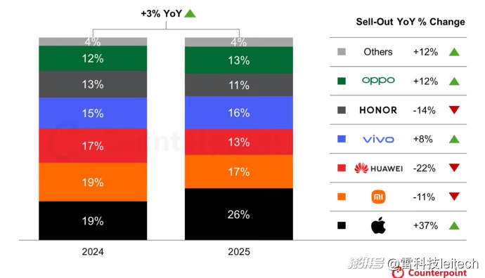 说实话,CounterPoint公布的数据确实与小雷此前猜想的挺大出入,比如报告显示苹果销量增长超37%。虽然早已料到苹果的销量不会差,但是确实没想到会涨这么多,因为今年苹果实行了很严格的限价令,以至于降价力度大不如前。