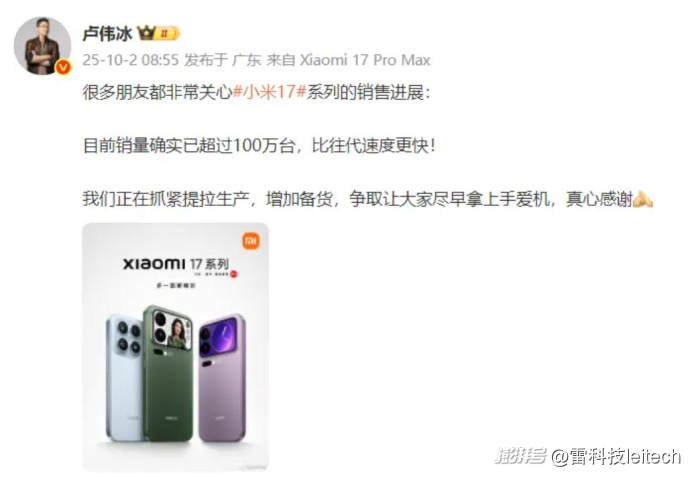 首先聊聊小米,今年的小米数字旗舰系列发布时间比往年提前了一个月,这也让原本刚好赶上双十一的首销期提前到了十月份。不要小看了首销期的销量,卢伟冰在10月2日就宣布小米17系列的销量突破100万台,与小米15系列的速度相仿。