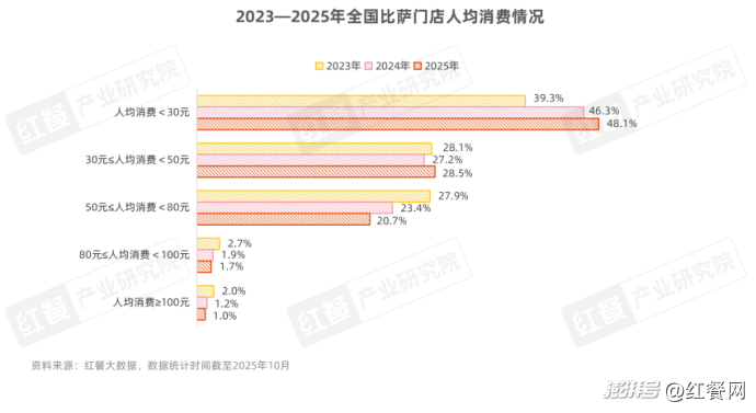 红餐大数据显示,截至2025年10月,人均消费在30元以下的比萨门店占比达48.1%,居于首位;其次是30-50元区间,门店数占比为28.5%;人均消费在50-80元区间的门店数占比也超过了20%;80元及以上的比萨门店占比则较少。