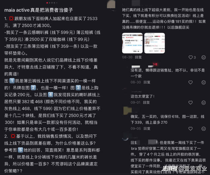 更实质性的伤害来自产品与渠道。有消费者反馈,被安踏收购后,MAIA产品质量出现明显下滑,部分瑜伽裤存在面料起球、缝线脱落等问题。更值得警惕的是不同渠道、不同货源的情况。同样有消费者反馈,在MAIA线上旗舰店、抖音直播间与线下专柜的同款产品,在面料触感、工艺细节上存在差异。