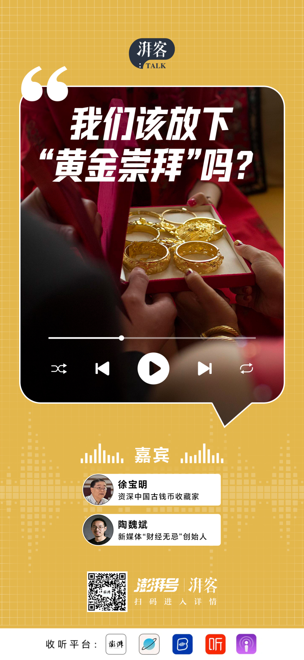 黄金在历史长河中扮演着怎样的角色?中国人对黄金的情结从何而来?当下金价高企,是入场时机还是风险信号?本期《湃客Talk》邀请了收藏有百余条老金条的古钱币收藏家徐宝明与长期观察黄金市场的媒体人陶魏斌,从历史、文化、投资三个维度,解读黄金的过去、现在与未来。