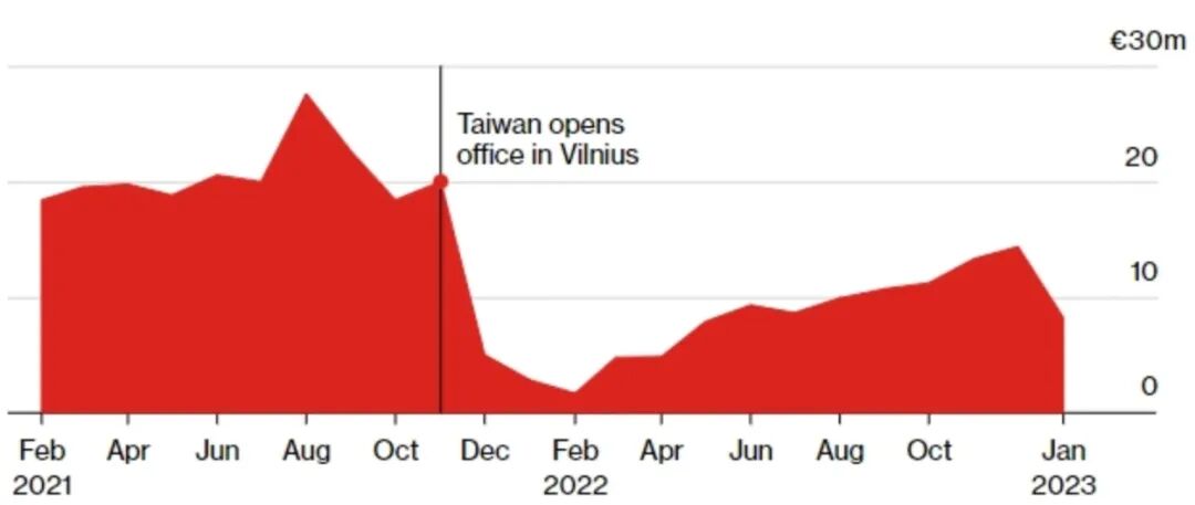 立陶宛对华出口额,数据来自欧盟统计局。彭博社制图