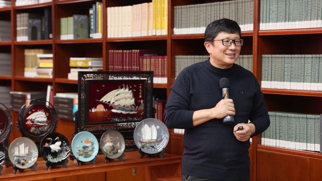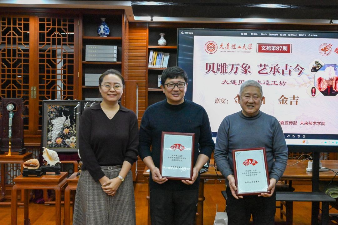 11月28日下午,由党委宣传部主办、未来技术学院承办、图书馆协办的文苑第87期“千年贝雕韵·匠心遇未来”非遗工坊在伯川图书馆凌水书屋举办。工坊特邀中国工艺美术大师、大连贝雕省级非物质文化遗产代表性传承人金阿山、金吉走进校园,为师生带来一场集文化解读、作品展示与动手实践于一体的中华优秀传统文化美育实践课。