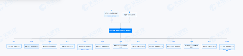 从天眼查披露的信息来看,目前坤华(天津)股权投资合伙企业(有限合伙)还持有包括晋江万达广场、淮北万达广场、赤峰万达广场等总计13家万达的项目公司。