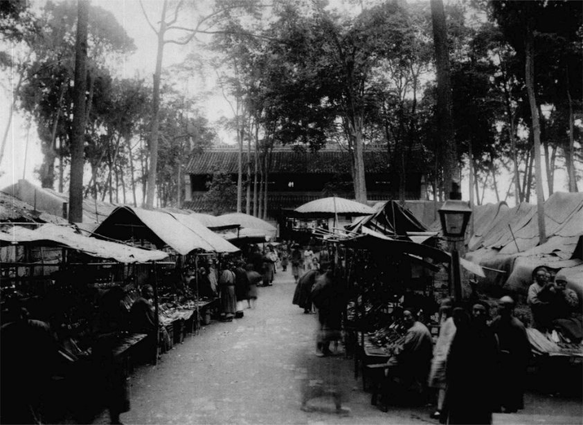 接下来,笔者将结合成都青羊宫花会作为成都集会的实例,来分析成都女性在此类场合下所遭遇的阻力。青羊宫位于成都西侧,而每年的二月至三月,成都城内以及城郊的民众都会前往青羊宫参加花会。一开始花会只是售卖花木、种子等,但随着市集的逐步扩大,农产品、工艺品、日用品等也逐渐在花会上进行售卖。同时,在花会期间,餐饮业、娱乐业也会在花会中开设店铺,为来往的民众提供休息、娱乐之场所。花会也因此成为了成都春日一场不可多得的盛会。刘师亮记载了青羊宫花会的盛况: