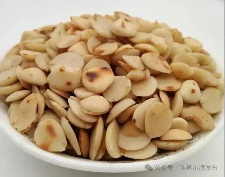 准格尔乡间的杏仁茶,带着浓郁的本土特色,做法虽简单却颇费功夫:先将杏仁与适量小米用新汲井水浸泡,捞出后剥去杏仁外皮,用石磨细细磨成糊状,再倒入开水持续熬煮四十分钟左右(中途不添生水),出锅后可根据喜好加茶、盐或糖调味后,便可享用。《齐民要术》记载:“杏子人,可以为粥。”这里的“杏子人”即杏仁,将做好的杏仁茶加入米再熬煮片刻,便是杏仁粥。除了直接饮用,杏仁茶还可搭配炒米、麻花、糕圐圙(黍米制成的糕圈)等食用,独具风味。