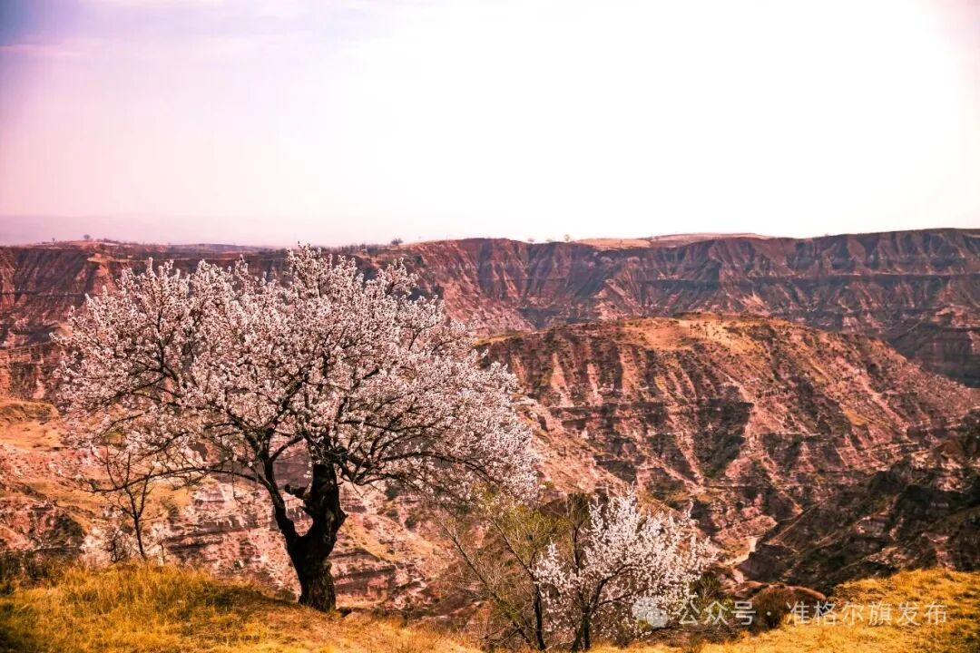 杏树生命力较强,极易存活,春暖花开的时节,在院落边角、墙角旮旯,或许什么时候就会悄悄冒出一株幼苗,不经意间便长得枝繁叶茂。在准格尔的梁峁川沟、田园地畔、农家院落,杏树几乎随处可见。这里是典型的中温带大陆性半干旱气候,冬季漫长,春日迟迟。初春时节,大地仍处于白居易“离离原上草,一岁一枯荣”的萧瑟里,远近皆是草木枯黄之景。而杏花总抢在草嫩叶绿之前绽放,起初是零零星星一两朵,几天后便满树芳华,点缀在以灰色为主色调的准格尔大地,宛如一幅幅素净拙朴的淡墨水彩画。