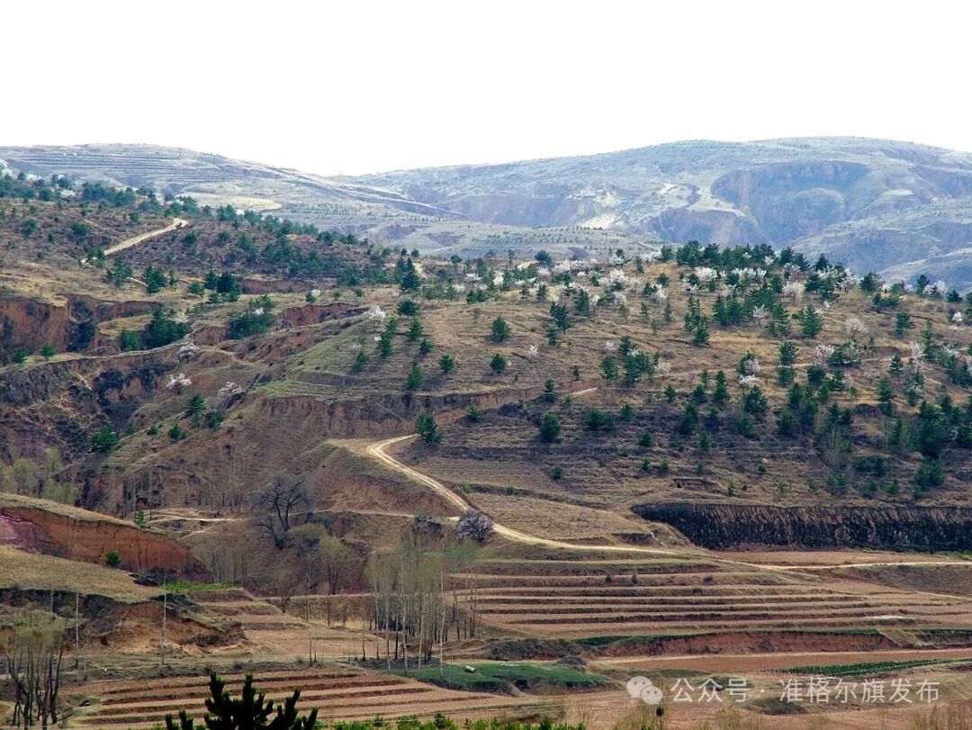 “准格尔地山架大,漫瀚调唱出的都是心里话。”准格尔旗地处鄂尔多斯高原之脊,属西北地区,地貌以丘陵沟壑为主,地势多褶皱,素有“七山二沙一分田”之说,民间常打趣说,“揪展了,面积肯定不小。”正因“山架大”等地理特征与独特气候,杏树成了当地最常见的果树。作为“三北”地区重要的防护林与水土保持树种,除野生品类外,大量栽植蔷薇科李属落叶乔木杏树,是准格尔旗改善生态环境、治理水土流失的重要举措。