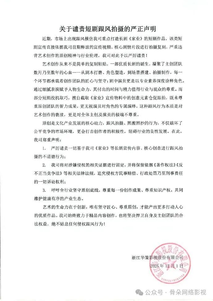 随着事件发酵,华策随即发表声明,称《家业》遭到跟风模仿,相关短剧直接依据其前期发布的宣传视频和核心剧情进行复刻拍摄,公司将采取维权措施。