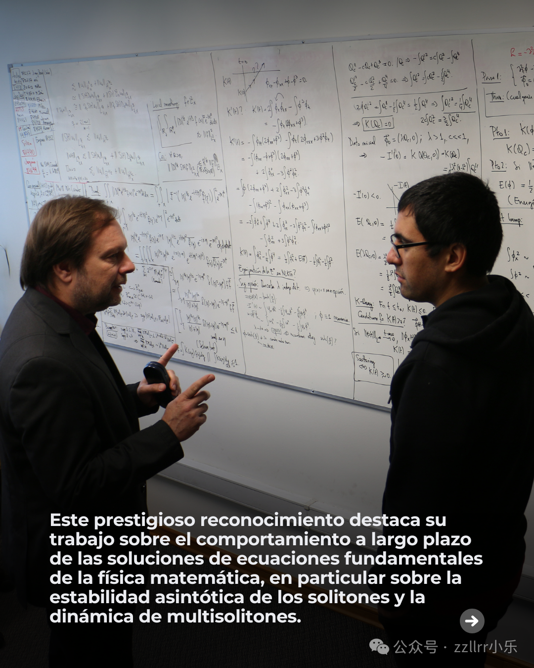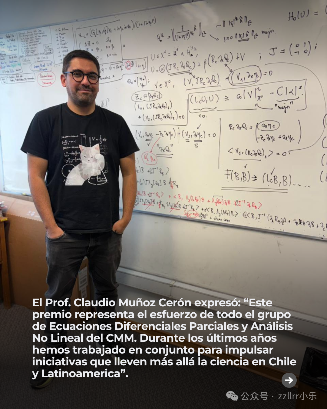 对我而言,这是莫大的喜悦,我为此感到无比自豪,也深感荣幸。这份荣誉是对我多年来在智利大学数学建模中心 (CMM) 和数学工程系 (DIM) 辛勤工作的认可。同时,我也要感谢我的同事 Miguel A. Alejo、Yvan Martel、Michal Kowalczyk 和 Felipe Poblete ,我们共同取得了重要的研究成果,他们也给予了我莫大的支持,无论是在个人层面还是职业层面。此外,我还要衷心感谢我的博士生和硕士生们,是他们让我有机会探索新的想法和概念。