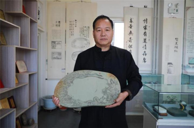 洪绪龙向记者展示自己的洮砚作品。新华社记者 梁军 摄
