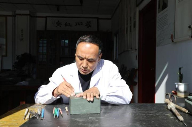 卢保胜在工作室创作洮砚。新华社记者 梁军 摄