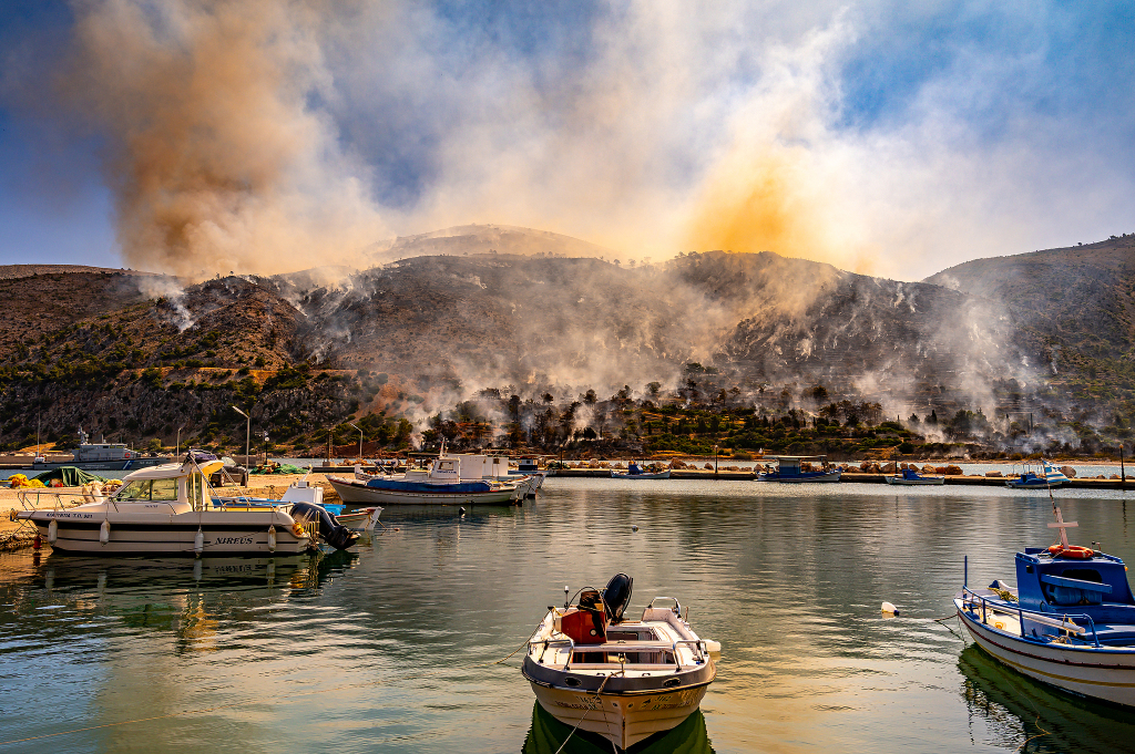 当地时间2025年6月24日,希腊希俄斯岛,渔船停泊在港口,背景是森林地区燃起的野火。视觉中国 图