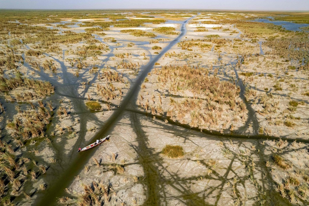 当地时间2025年7月30日,伊拉克南部济加尔省,一幅航拍画面捕捉到当地居民在奇巴伊什沼泽地的船只上休憩。这片沼泽因干旱水位消退,形成了纵横的沟渠。目前,伊拉克正面临着气温攀升、长期水资源短缺和连年干旱。视觉中国 图