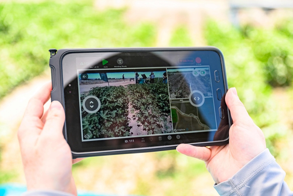 2025年6月26日,美国加利福尼亚州洛斯巴诺斯,鲍尔斯农场,一名操作员远程控制Aigen公司的一款由太阳能驱动的自主人工智能机器人“Element”。随着美国各地农场面临劳动力短缺,以及杂草对除草剂产生抗药性,初创公司Aigen推出了一种机器人解决方案,该公司表示这可以为农民节省资金,帮助保护环境,并使农产品远离有害化学物质。视觉中国 图
