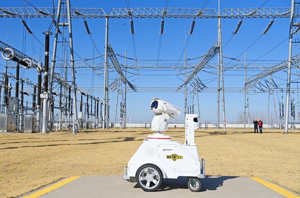 2025年2月10日,安徽滁州,在南谯区500千伏变电站,运维人员和一台5G智能机器人正在对变电站主要设备进行智能特巡。视觉中国 图