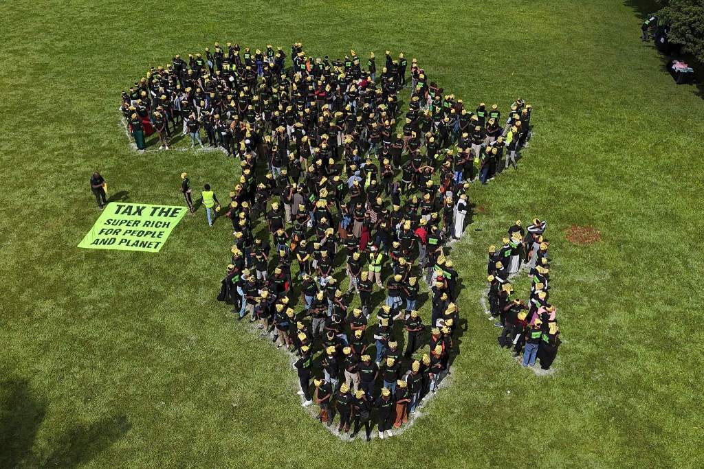2025年11月8日,肯尼亚内罗毕,300多名非洲志愿者组成了一个巨大的非洲大陆图案,他们呼吁各国政府为气候融资提供资金。视觉中国 图