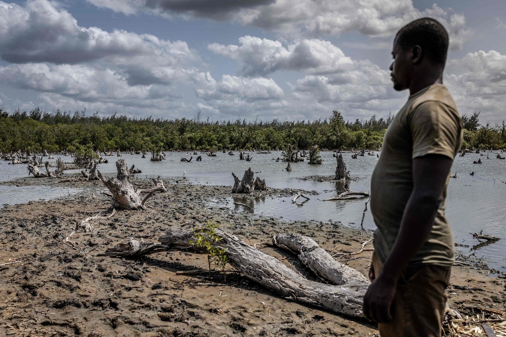 当地时间2025年8月5日,肯尼亚马雷雷尼,一名居民查看红树林区域。几年前,这里的红树林因死水和森林砍伐而遭到破坏。后来,在全球捐款帮助下,当地人开始种植、培育和保护这些树木。现今,这里已经恢复了数百万棵红树林,使鱼类资源和生物多样性得以恢复,保护了海岸线。视觉中国 图