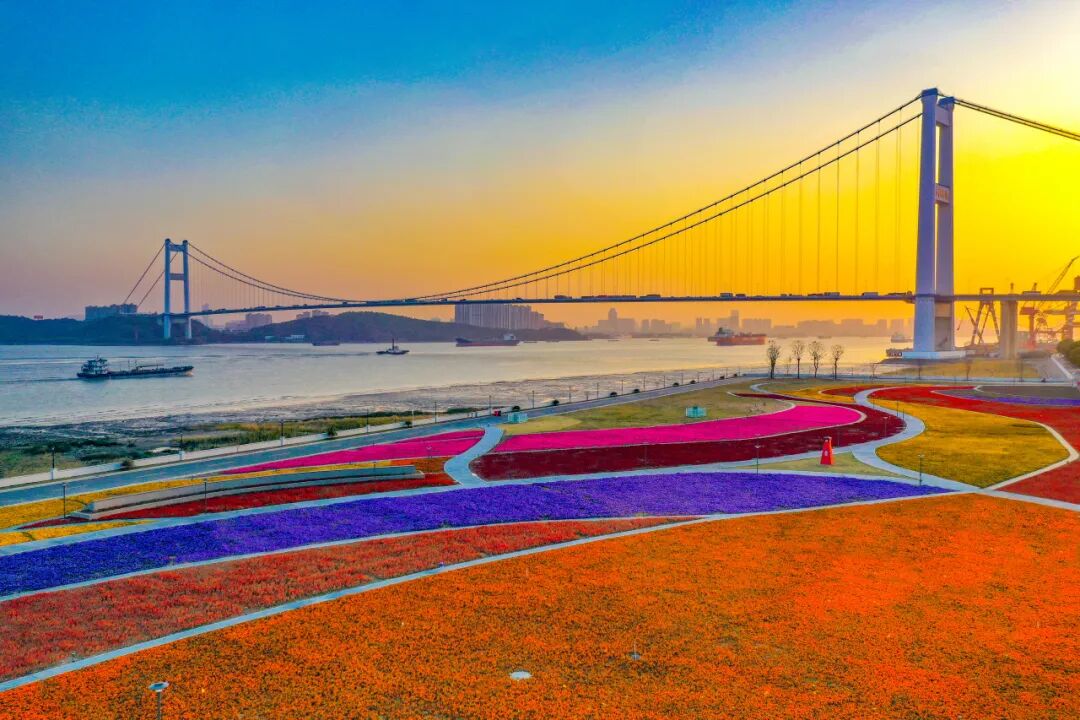 靖江滨江花海位于江苏泰州市靖江市滨江公路与荟民路交叉口南300 米,是靖江标志性的四季花卉景观区,毗邻长江岸线。公园占地面积达 3700亩,以 “四季有花、步步皆景” 为特色,划分玫瑰园、郁金香园、向日葵园、梅园等主题区域——春季郁金香铺展成彩色花毯,秋季万亩向日葵花海向长江绽放,冬季梅林暗香浮动,夏季更有音乐喷泉与花海相映成趣。漫步花田栈道可远眺长江波光,傍晚时分夕阳洒在花海上,构成滨江独有的浪漫画卷。