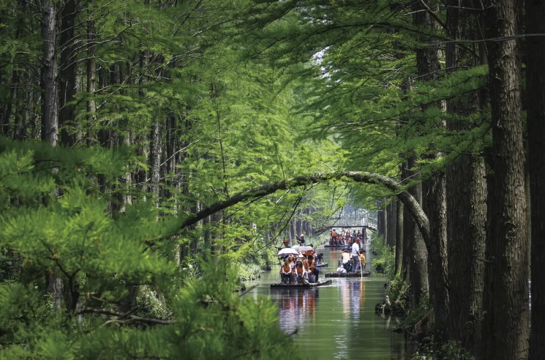 李中水上森林公园位于江苏泰州市兴化市千垛镇舜川路1号,是国家AAA级景区,也是江苏省最大的人工湿地生态林,被誉为“江南小九寨”。公园原为荒滩,上世纪80年代经改造形成垛格湿地,栽种水杉、池杉,形成 “林在水中长、船在林中游” 的独特景观。乘竹筏漂流可惊起林间白鹭、野鸭,徒步板桥栈道能穿行“雾森幻境”,春季二月兰与夏季荷花点缀林间,负氧离子含量极高。