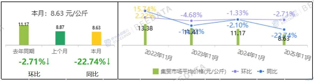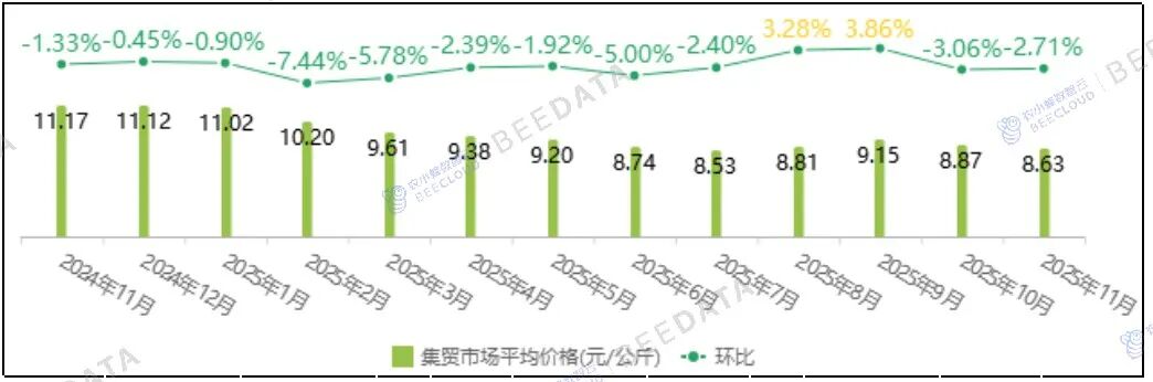2025年11月,全国鸡蛋集贸市场平均价格为8.63元/公斤,与上月相比,下跌了2.71%;与去年同期相比,下跌了22.74%。