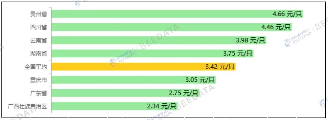 分省域来看,2025年11月,“四川省、湖南省、云南省、广东省、广西壮族自治区、贵州省、重庆市”7个省域商品代肉雏鸡集贸市场平均价格在2.34~4.66元/只之间不等。其中,广西壮族自治区价格相对较低;贵州省价格相对较高;广西壮族自治区、广东省、重庆市价格低于全国平均水平;湖南省、云南省、四川省、贵州省价格高于全国平均水平。