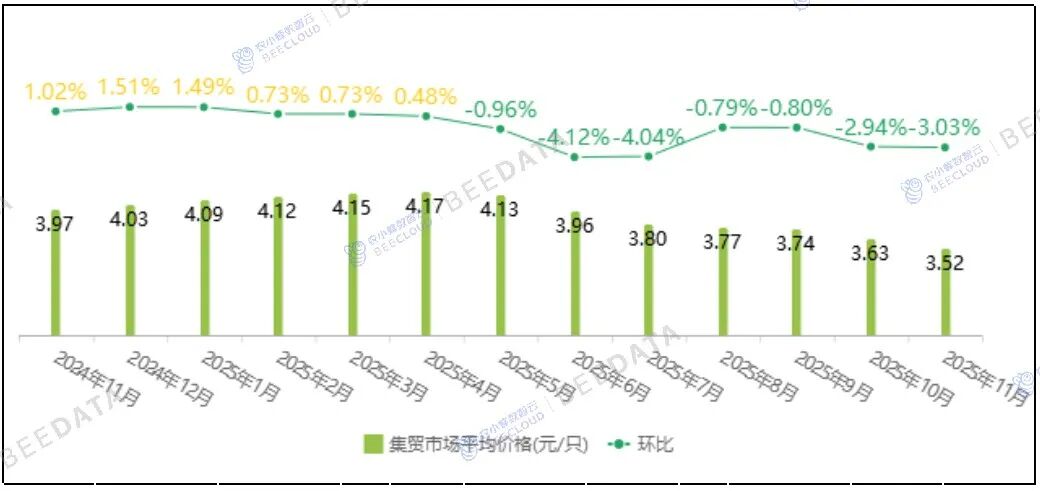 从近13个月监测数据来看,2024年11月~2025年11月,全国商品代蛋雏鸡集贸市场平均价格从3.97元/只波动至3.52元/只,每月对应的环比上涨/下跌幅度也由1.02%波动至-3.03%;峰值为2025年4月的4.17元/只,谷值为2025年11月的3.52元/只;主要在2024年11月、2024年12月、2025年1月、2025年2月、2025年3月、2025年4月出现过环比持续上涨趋势,其余监测时间节点均呈现环比持续下跌趋势,2025年5月~至今已连跌7个月。