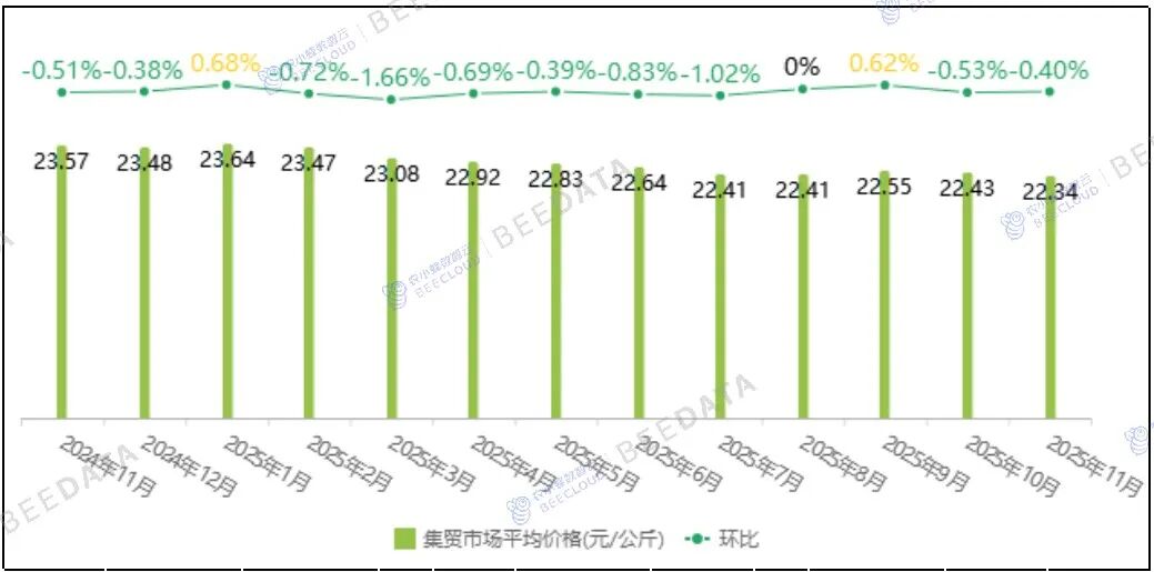 2025年11月,全国鸡肉集贸市场平均价格为22.34元/公斤,与上月相比,下跌了0.40%;与去年同期相比,下跌了5.22%。