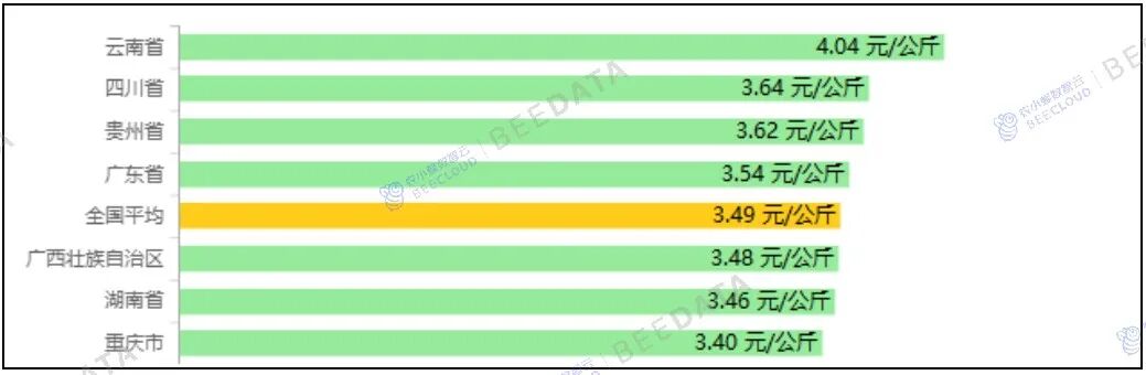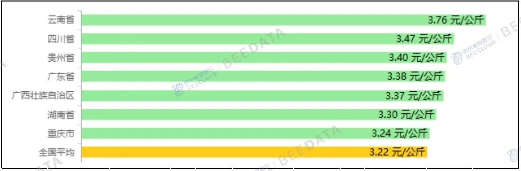 分省域来看,2025年11月,“四川省、湖南省、云南省、广东省、广西壮族自治区、贵州省、重庆市”7个省域蛋鸡配合饲料集贸市场平均价格在3.24~3.76元/公斤之间不等,均高于全国平均水平。其中,重庆市价格相对较低;云南省价格相对较高。