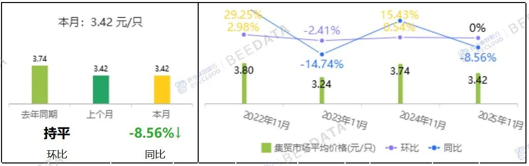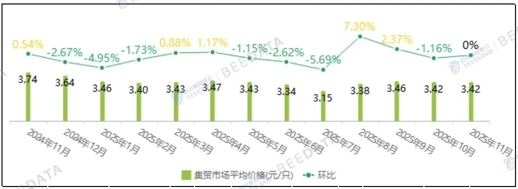 2025年11月,全国商品代肉雏鸡集贸市场平均价格为3.42元/只,与上月相比,基本持平;与去年同期相比,下跌了8.56%。