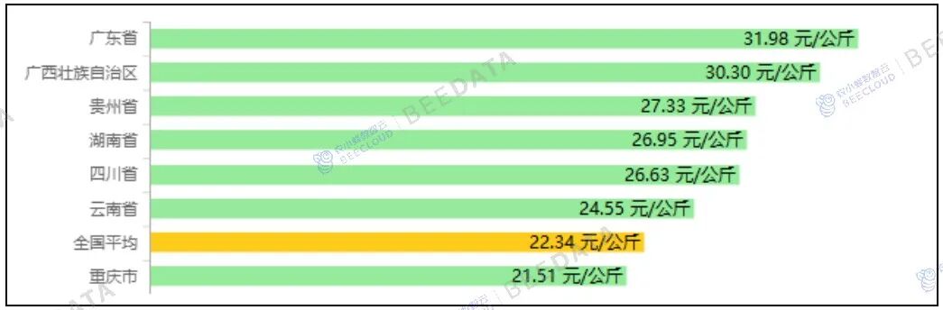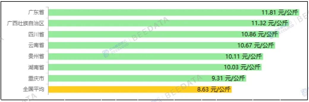 分省域来看,2025年11月,“四川省、湖南省、云南省、广东省、广西壮族自治区、贵州省、重庆市”7个省域鸡蛋集贸市场平均价格在9.31~11.81元/公斤之间不等——均高于全国平均水平。其中,重庆市价格相对较低;广东省价格相对较高。