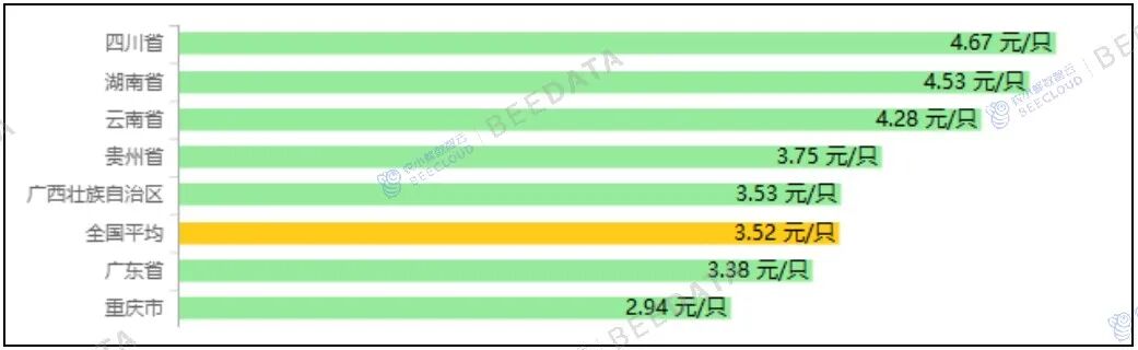 分省域来看,2025年11月,“四川省、湖南省、云南省、广东省、广西壮族自治区、贵州省、重庆市”7个省域商品代蛋雏鸡集贸市场平均价格在2.94~4.67元/只之间不等。其中,重庆市价格相对较低;四川省价格相对较高;重庆市、广东省价格低于全国平均水平;广西壮族自治区、贵州省、云南省、湖南省、四川省价格高于全国平均水平。