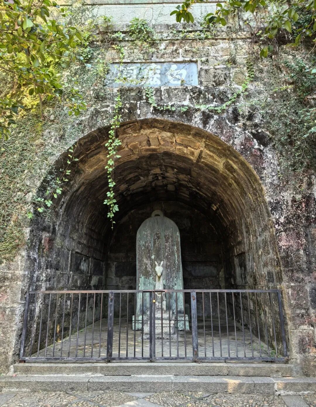 景点介绍牌上的文字,勾勒出这尊石鹿的曲折命运。白鹿洞原本有名无洞,明嘉靖年间,南康知府王溱为契合“洞”名,特意凿山开洞;知府何岩又琢石为鹿,置于洞中,让“白鹿洞”的意象真正落地。可后来有官员认为此举“凿山破气”,不合风水,竟将石鹿埋入地下。这一埋,便是数百年,直到上世纪80年代维修礼圣殿时,工人在地下偶然发现了这尊石鹿,才让它重见天日,回归洞中,成了如今游人驻足观赏的景致。