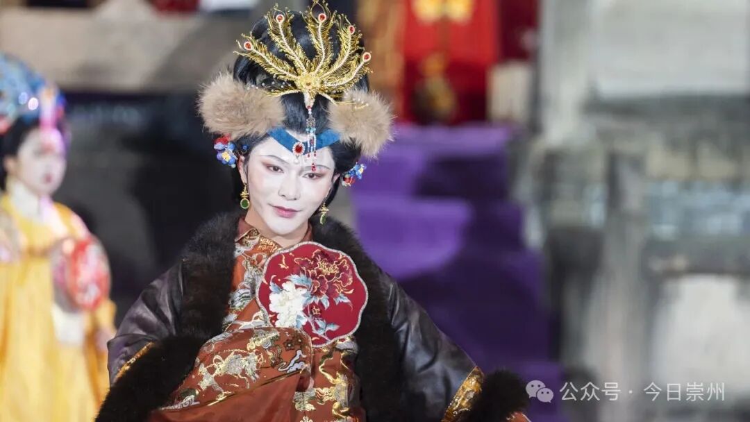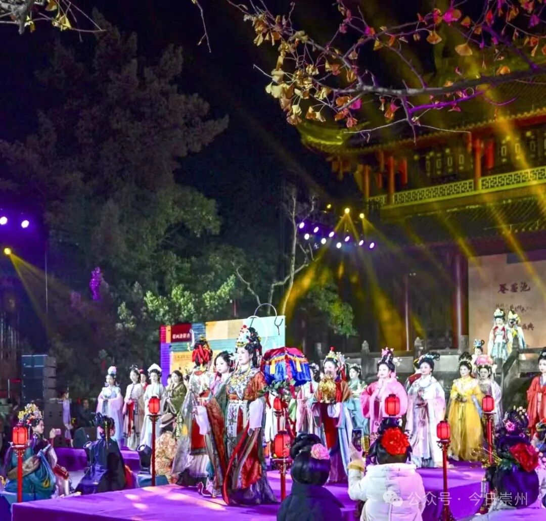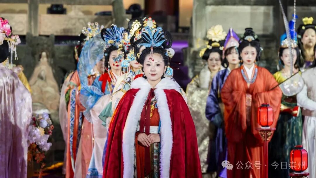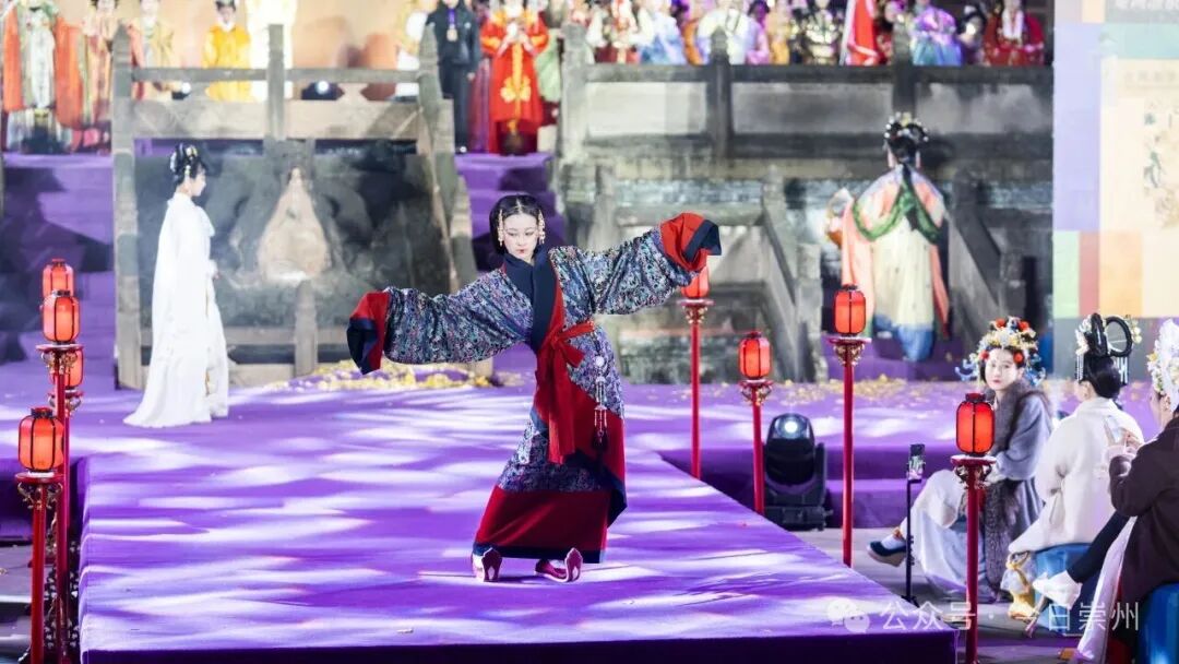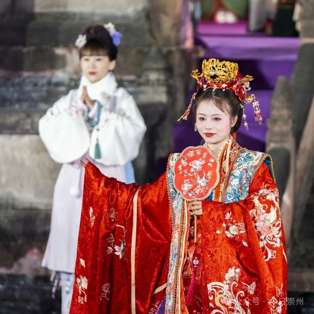 杨贵妃、林黛玉、贾宝玉、王熙凤、贾元春等经典人物依次亮相,举手投足间将角色神韵复刻得惟妙惟肖。当“宝黛大婚”的经典场景重现时,身着大红婚服的“宝玉”与“黛玉”并肩而立,繁复的嫁衣上绣满吉祥纹样,凤冠霞帔熠熠生辉,瞬间引起台下观众阵阵掌声,仿佛一场跨越时空交流就此展开。