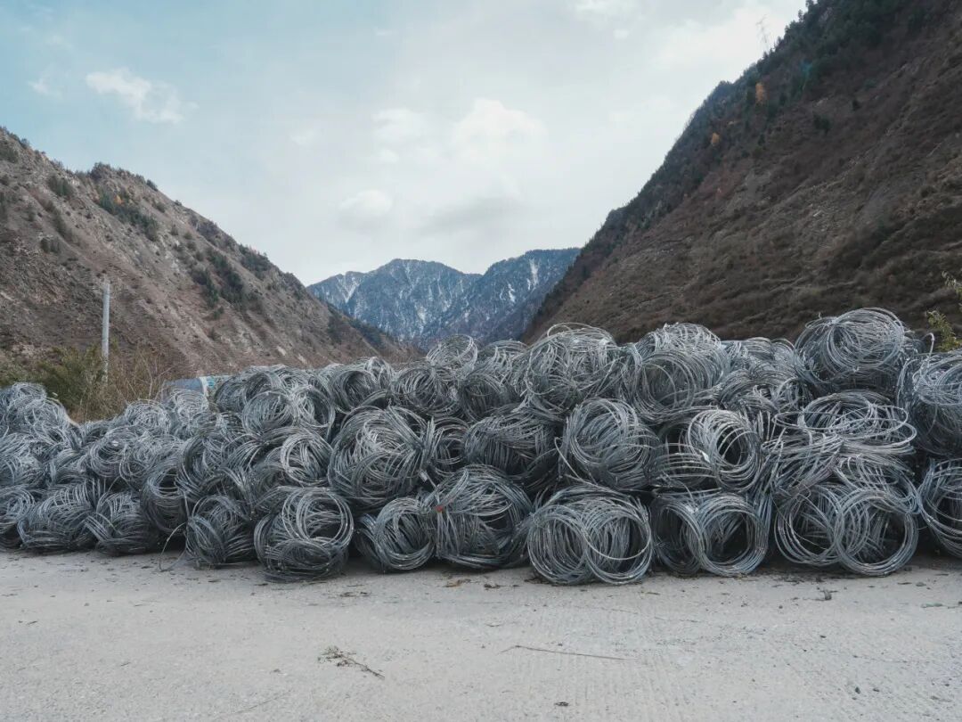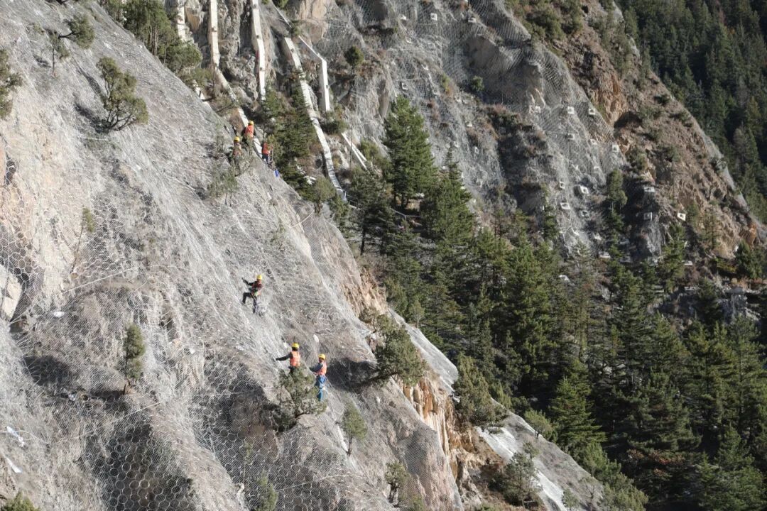 此次防护工程需在垂直高差400米、坡度约70°的山坡上铺设两万余平方米主动防护网,共计运输121吨钢材与构件。