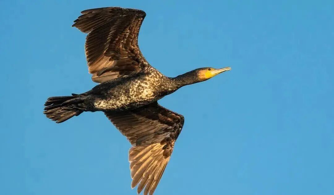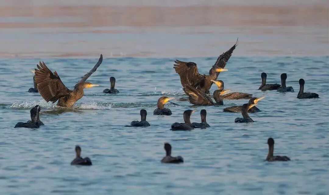 ▲在月牙岛北湖上,国家二级保护动物鸬鹚成群舒展双翼。