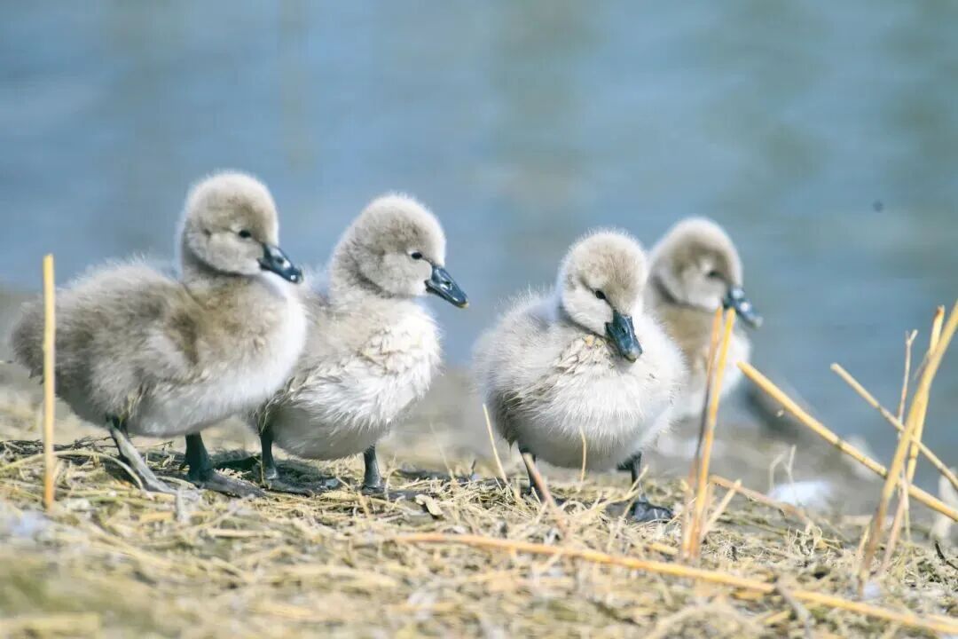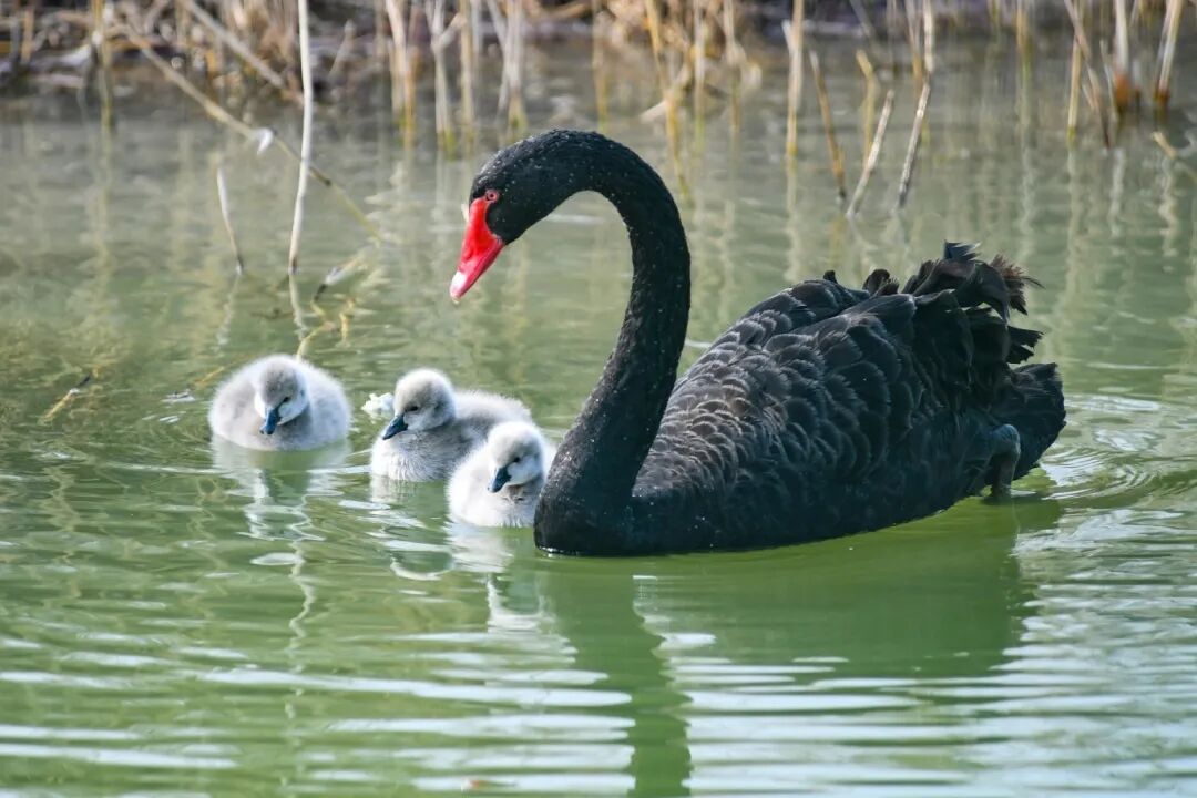 ▲月牙岛,黑天鹅家族喜添新丁,4只毛茸茸的黑天鹅宝宝破壳而出。