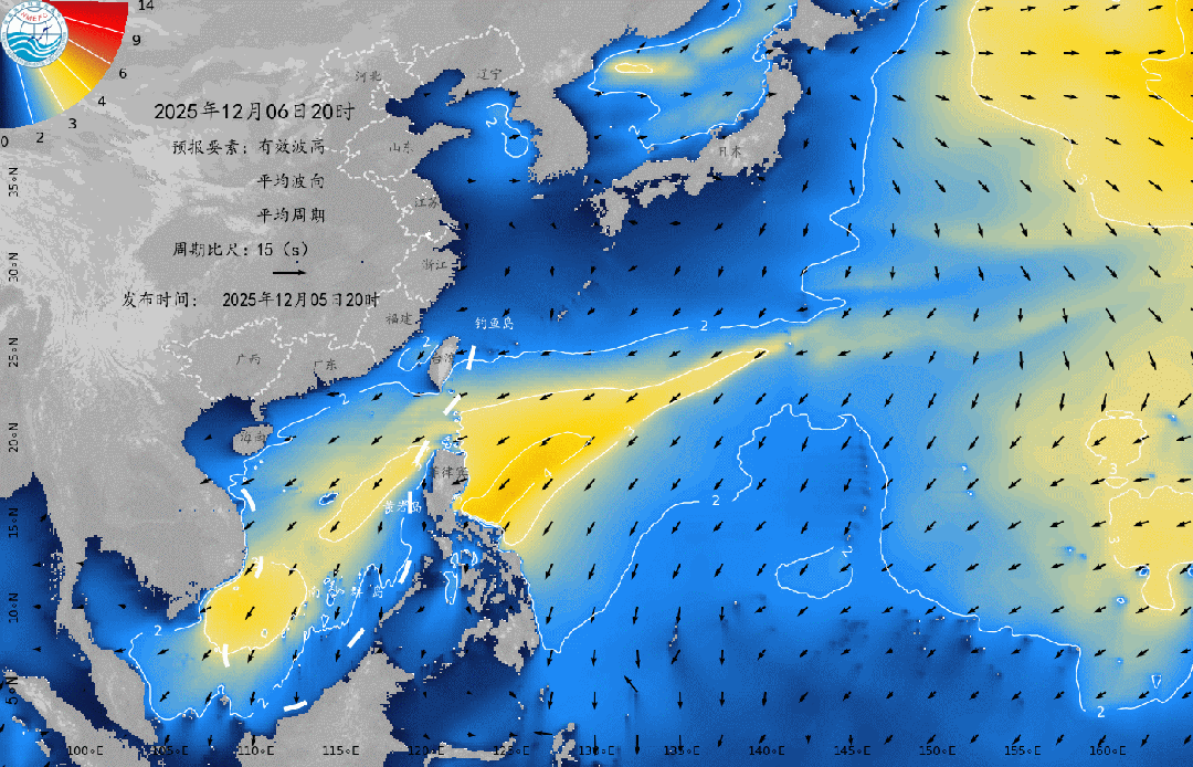 (1)受冷空气和补充冷空气的影响,预计12月7日渤海、黄海有2到2.5米的中浪到大浪区;预计12月8日-9日,东海、台湾海峡有2.5到4米的大浪到巨浪区;预计12月6日-11日,南海仍将维持3到5米的大浪到巨浪区。