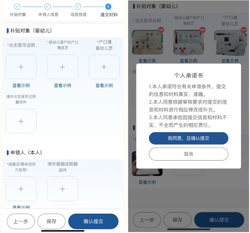 第五步:按照提示提交出生医学证明、婴幼儿落户户口薄首页、户口薄婴幼儿页、结婚证等判定抚养关系的相关材料,点击“确认提交”按钮。