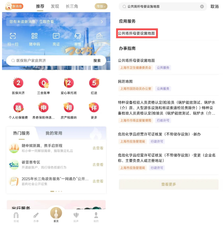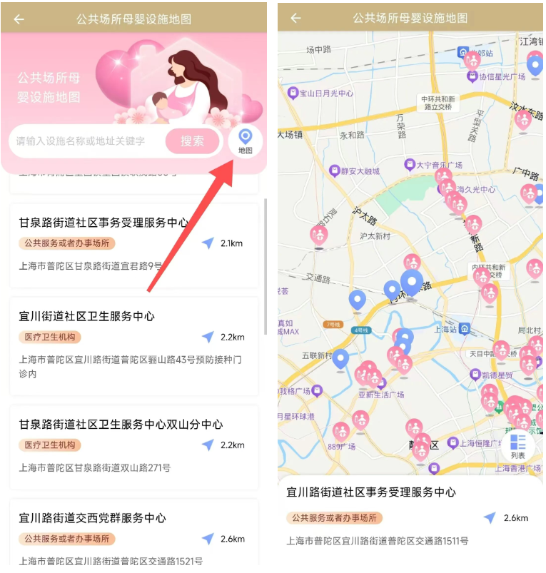 进入方式:打开“随申办市民云”APP首页搜索“公共场所母婴设施地图”,点击进入。