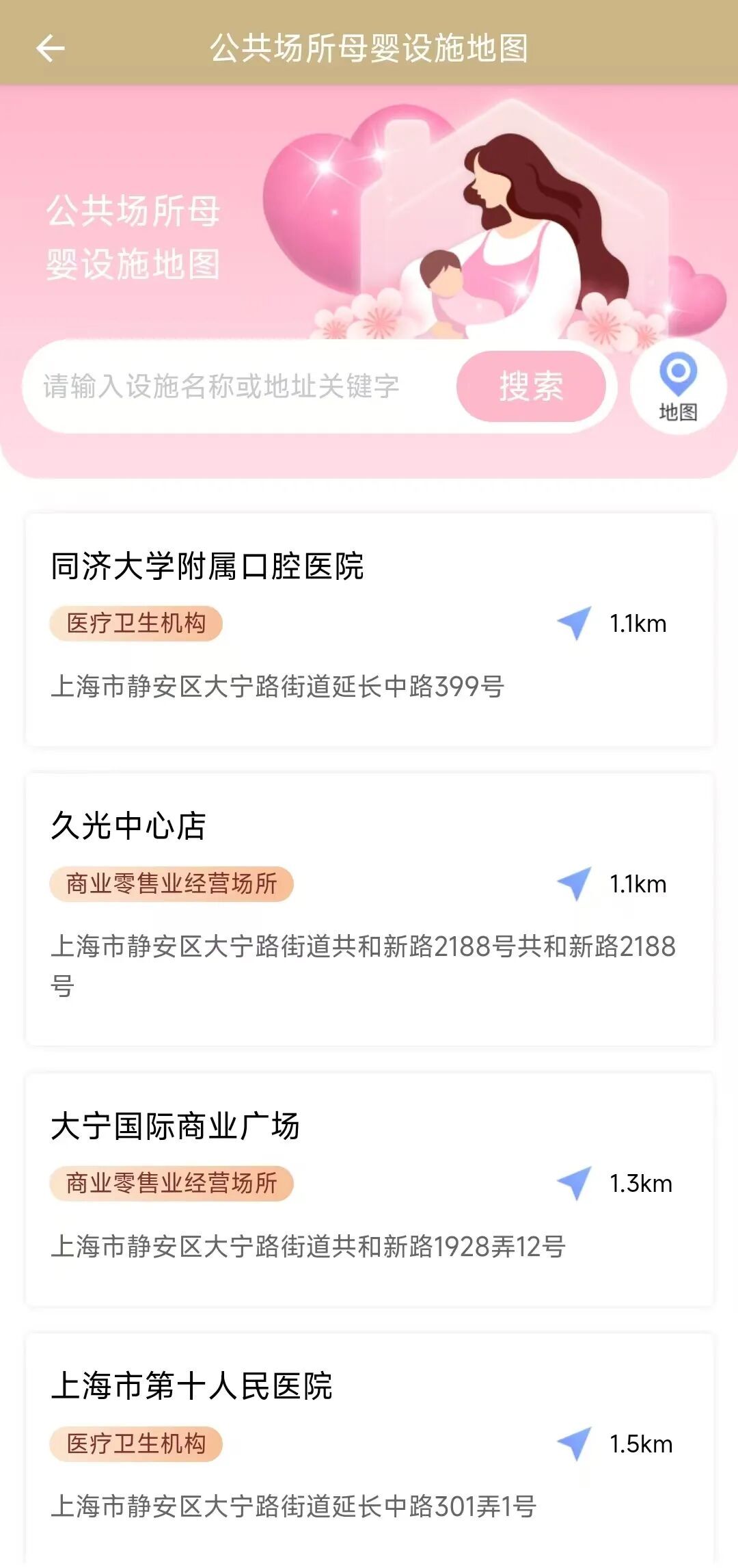 按照提示打开定位后,即可查看附近的公共场所母婴设施。