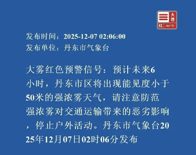 大雾红色预警信号:预计未来6小时,丹东市区将出现能见度小于50米的强浓雾天气,请注意防范强浓雾对交通运输带来的恶劣影响,停止户外活动。丹东市气象台2025年12月7日2时6分发布。