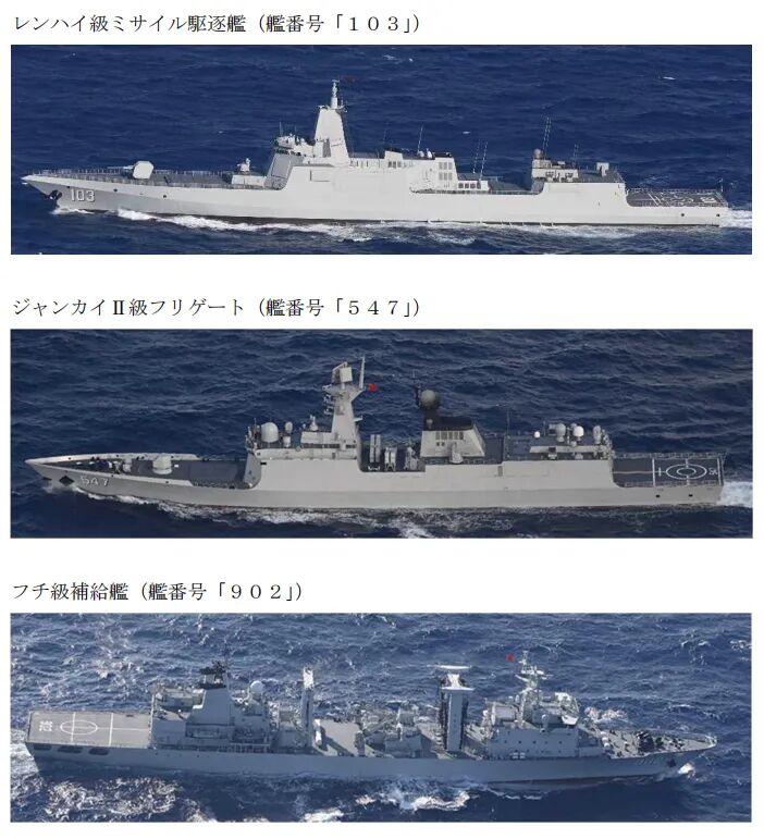 此外,当地时间5日下午3时左右,日本海上自卫队确认,在宫古岛以东约120公里的海域,有3艘中国海军舰艇正朝西北方向航行,分别为055型导弹驱逐舰鞍山舰(103)、054A型导弹护卫舰临沂舰(547)以及903A型综合补给舰东平湖舰(902)。随后,这3艘舰艇穿过宫古海峡继续向西北方向航行,驶入东海。