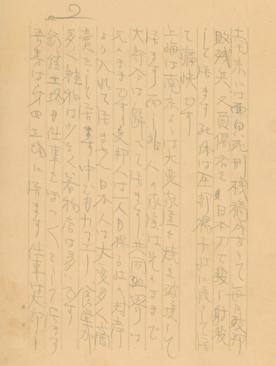 第一封由日本友人捐赠,是侵华日军国崎支队步兵第四十一联队士兵村田芳夫于1938年1月8日写给父亲村田龟太郎的4页铅笔家信。其中在信件第2页,村田芳夫以灭绝人性的轻松口吻记述:“南京有一座很有意思的死刑栈桥,每天都在用日本刀斩杀或射杀中国败残兵或伤兵,并且把尸体全部抛入扬子江冲走,真痛快。”