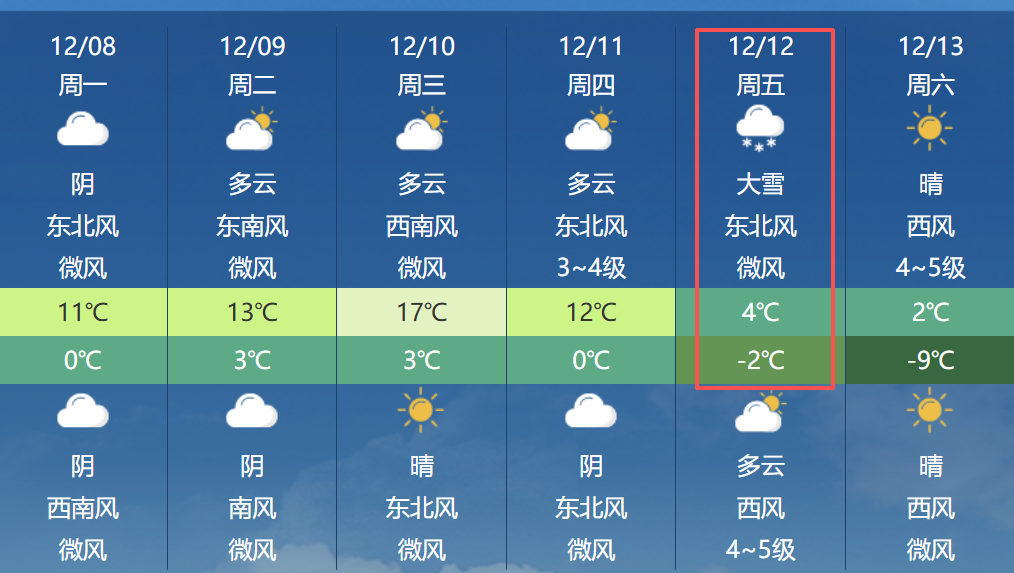 12月8日,周一。一条来自气象部门的消息引发了大家的普遍关注:打开中央气象台以及多个主流气象软件,在最新的天气预报中,本周五(12月12日),郑州的天气一栏被明确标注为“大雪”。