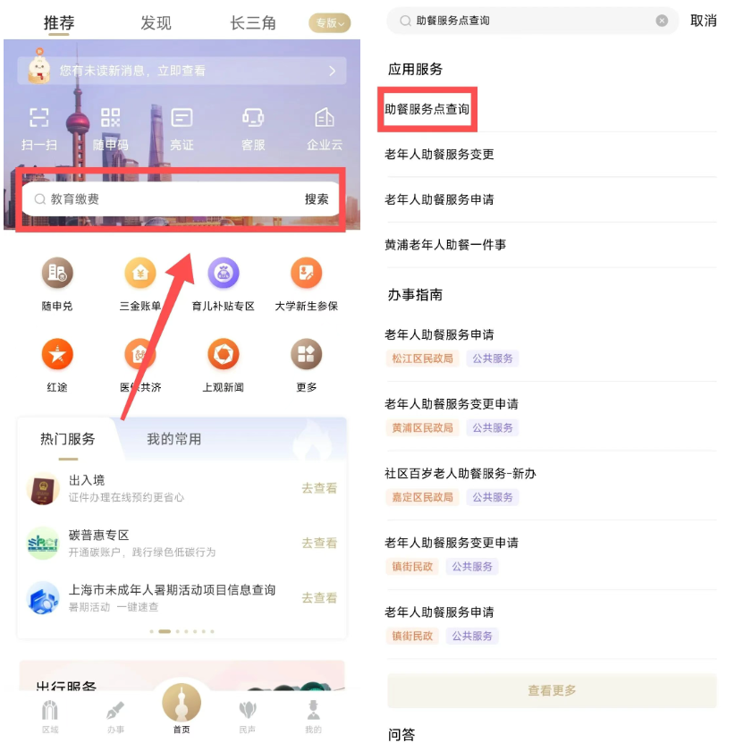 打开“随申办市民云”APP,在首页通过关键词搜索“助餐服务点查询”,点击对应选项即可进入服务。