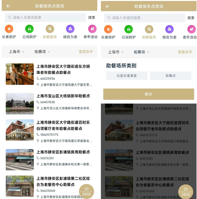 打开手机定位,或主动选择所在区域街道等信息,即可查看筛选后的社区食堂、助餐点位置。