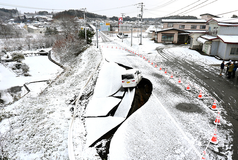 当地时间2025年12月9日,日本青森县东北町,一辆汽车停在因7.5级地震而受损的坍塌道路上。视觉中国 图